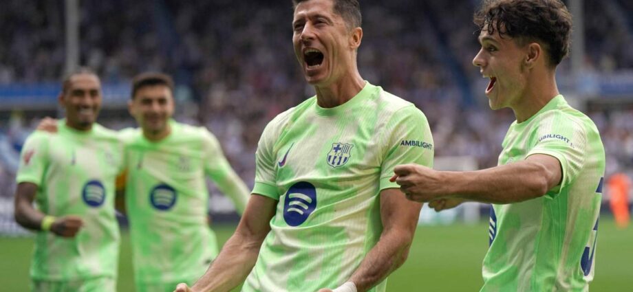 El delantero del Barcelona Robert Lewandoswki reinó este domingo en Vitoria con tres goles en el primer tiempo que confirmaron el liderato del conjunto azulgrana, que se impuso al Deportivo Alavés por 0-3.