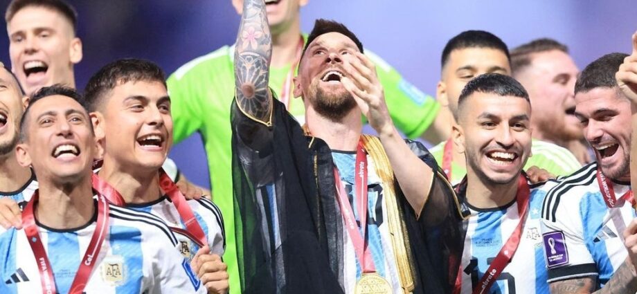 Al momento de recibir el anhelado trofeo en el Mundial, Messi fue vestido con un llamativo atuendo.